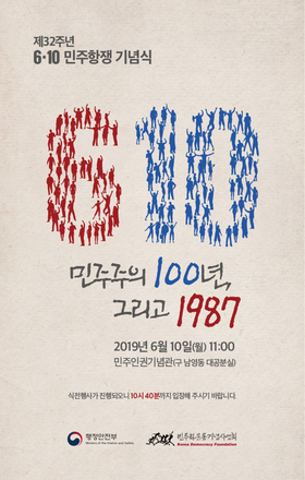 서울(의왕)--(뉴스와이어) 2019년 06월 07일 -- 6월 10일(월) 오전 11시 민주인권기념관(옛 남영동 대공분실)에서 행정안전부가 주최하고 민주화운동기념사업회가 주관하는 ‘제32주년 6·10민주항쟁 기념식’이 민주화운동 관련 인사 및 진영 행정안전부장관, 각 당 대표 등 정관계 인사 400여명이 참석한 가운데 개최된다. 남영동 대공분실(민주인권기념관)은 6·10민주항쟁의 도화선이 된 ‘박종철고문치사 사건’이 일어난 비극의 현장으로, 대한민국 민주주의의 전환점이 되었던 6·10민주항쟁의 의미를 오늘에 되새기고, 민주주의와 인권의 소중함을 기억하기 위한 기념식 장소로 선정되었다. 미투 운동으로 우리 사회에 경종을 울린 ‘서지현 검사’와 민주기업 문화전파를 위해 분투 중인 ‘박창진 전 대한항공 사무장’의 사회로 진행되는 이번 기념식은 ‘역사어린이합창단’의 사전 공연, 경과보고 영상 상영, 애국가 제창, 대통령 기념사(진영 행정안전부 장관 대독), 축하 공연, 국민의 소리, ‘광야에서’ 제창 등의 순서로 진행될 예정이다. ‘민주주의 100년, 그리고 1987’이라는 주제로 기획된 이번 행사는 3.1운동이 발생하고 우리나라 최초로 민주공화제를 선포한 임시정